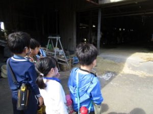 おおきな脱穀機をみて、少し緊張気味なA組さん。