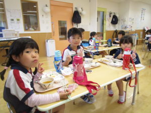 いただきますをして真っ先におにぎりを頬張るみんな。