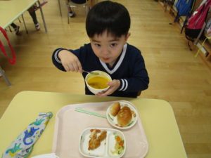 今日の給食で出たスープを見ながら子どもたちは、歌詞にちなんで「ミルクたっぷりかなぁ」