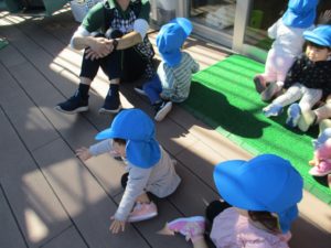 全員の靴が履き終わるのを体操座りして待つお友だち♡準備が出来てレッツゴー!!