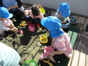 1歳児のお友だちは砂場遊びをおこないました。