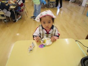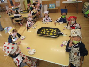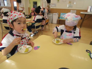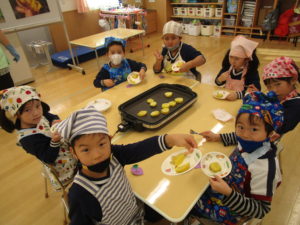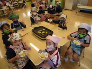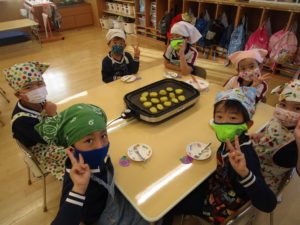 お昼寝の後は、午前中に収穫したさつまいもを使ってのクッキングです。