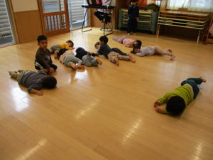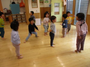 その後は前回取り組んだむっくりくまさんに今日も挑戦!手を繋いで輪になること、そのまま歌って輪を崩さないように歩くこと、一見簡単そうに見える動きでも、友達が転んでしまわないように気を付けたり、力加減を考えながら取り組まなくては行けなかったり、互いに気を付けながら取り組まなければならない動きが多いのですが、2回目にしてそれらがとても上手にできていました。