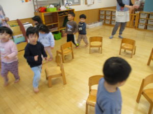 その後は椅子取りゲーム!今日も1回、2回と周回するごとに勝ち残る子ども達が変わって面白い展開になりました!負けてしまった悔しさから泣き出す子も多くなりましたが、気持ちを切り替えて再度取り組めるようにもなり、この点でも成長を感じました!
