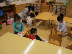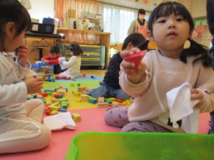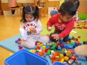 掃除が終わった後は、きれいにしたおもちゃを使ってお部屋でゆったりと遊んで過ごしました。