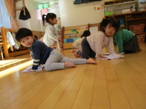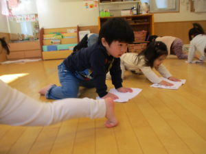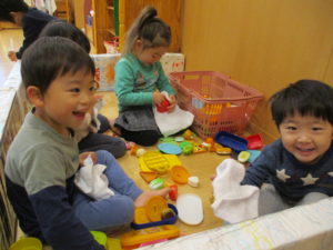 机、椅子、ロッカーのカゴ、お部屋の玩具、最後に床拭きとたくさん掃除に取り組んだ子ども達でしたが「せんせいといっしょだね」と友達と話しながら楽しく過ごしていました。雑巾の使い方がとても上手だったので、ご家庭でも機会があればお子様と掃除を共に行ってみてはいかがでしょうか。