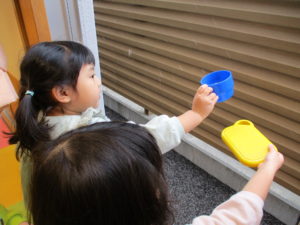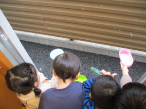 「ねぇ、ゆきつかまえたい!」「どうしたらつかまえられる?」と友達と相談しながら、どうにかして雪をつかまえようと考えを巡らせた結果、ままごとの器を窓から外に突き出して中に入れることに!