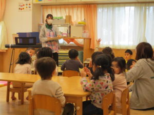 登園時間はぽかぽか組で合同で遊びながら、9時頃きらきら組に移動して朝の会をしてから午前おやつを食べます!朝の会の歌を唄う時間、月の後半にもなるとみんなが歌を覚えて大きな声で唄っている姿が本当に素敵です。散歩中も唄っていたり、歌の時間は子ども達も大好きなんだなぁと感じております。