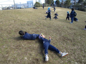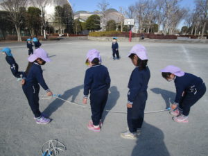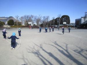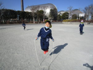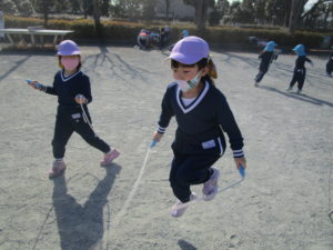 自由広場では、サッカーや縄跳び、しっぽ取りゲーム、追いかけっこをして遊びました!跳べる回数が増えて来たり、片足跳びも出来るようになり嬉しそうに披露してくれる子ども達。長縄も上手に跳べる子が多くなりました。