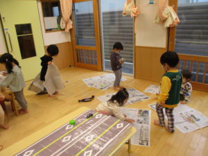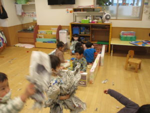 お部屋で色々な遊びをして過ごしましたが、朝、広告紙で遊んでいたことから、途中から新聞紙遊びをやりたいとお話しする子が多く、途中から新聞紙遊びを行いました!