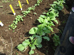 こちらはラディッシュ。左側の小さい方が、子どもたちが蒔いた種から芽が出たもの、 右側の大きい方が少し早く蒔いたもの。どちらも順調に大きくなっていました。