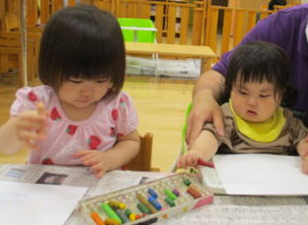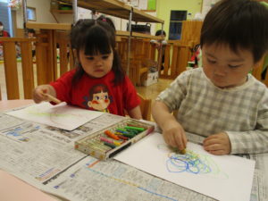 ▼クレヨンでのお絵描きに挑戦する0歳児クラスのお友だち。