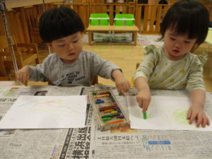 クレヨンを触り慣れていないので、みな興味津々。