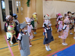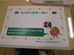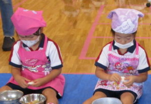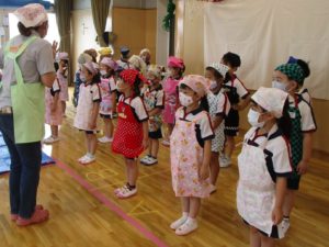 今日はまちにまったカレー会。”かわいいコックさん” に変身したAB組のお友だちが、保育園の畑で採れた【じゃがいも】、お隣の畑のかた(在園児のおじいちゃま)に分けて頂いた【たまねぎ】を使っておいしいカレーをつくりました。