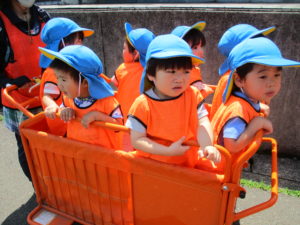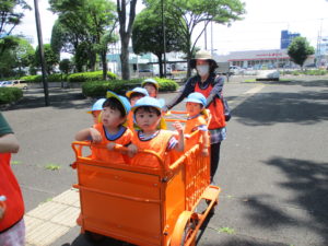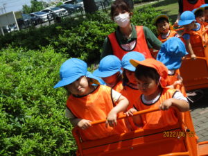 6/22(水)【きらきら】戸外散歩 2022/06/22 梅雨の合間にお日様が顔を出しました。きらきら組初の戸外活動です。 昨日の雨と、初めての戸外ということもありカートに乗って、秋葉台公園を一周しました。 眩しい太陽と風を感じて、みんなきらきらの笑顔が輝いていました。 風がつよいね! あれは、なんだ? お日様、まぶしいね! きらきら 松下