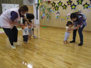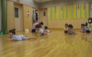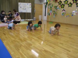 ▼ハイハイレース!0歳児さんは保育者と一緒に。きらきらさんはほふく前進!?