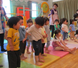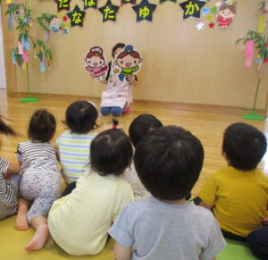 今日は乳児クラス合同で七夕集会を行いました。今日の集会はお楽しみが盛りだくさん!! ①園歌を歌おう ②『たなばた』ってなぁに? ③ハンドベルのプレゼント ④ハイハイレースをしよう 『はみがき集会』や『誕生会』を経験し、ホールでの集会にもだいぶ慣れてきた様子のお友だち☆お話を聞くのもとても上手になりました。特に今日素晴らしかったのが、ハイハイレースでの応援!!自分の番ではない時も「がんばーれ、がんばーれ」と両手を叩いて一生懸命応援してくれました。そんな優しい心のお友だちのお願い、きっとお星さまに届きますね☆