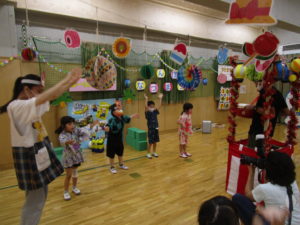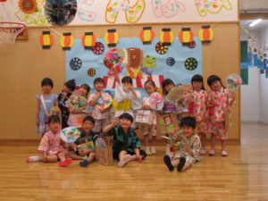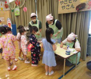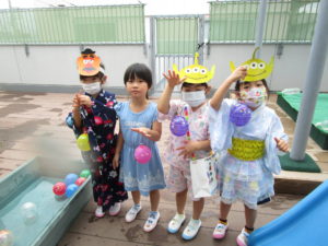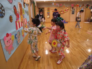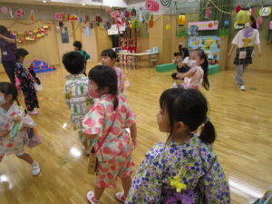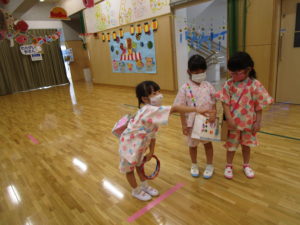 楽しみにしていた『なつまつり』。家族の方と一緒に作った手作りバックに、手作りうちわとスタンプカードを入れて出発!!風鈴のゲートをくぐり抜けて会場に入ると「輪投げ」「ボーリング」「的当て」などなど、たくさんのコーナーがみんなを迎えてくれました。スタンプカードにシールを貼ってもらいつぎのコーナーへ、お土産でバックがいっぱいになりました。スイカ割りではちょびりヒビがはいるだけで割ることはできませんでしたが、これも楽しい思い出になるでしょう。お昼寝もホールで行いました。そして、天井には大きな花が咲き、歓声をあげるA組さんでした。保護者の皆様にはバック作り、うちわのご用意、ペットボトルの加工などのご協力ありがとうございました。たくさんの思い出をつくることができました。