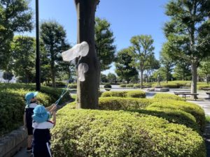 毎年この時期になると、5歳児さんと園長が、朝の秋葉台公園へせみとりにでかけます。” 朝の早い時間=暑さが柔らかい時間 ” と言えども、●年々暑さが厳しくなっていること ●子どもは大人より背丈が低く暑さを感じやすいことも・・・もあり、短時間勝負!!