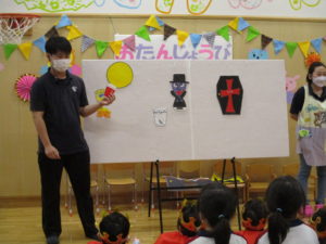 ▼職員からの出し物は『お化けマンション』♪今夜は丸い月の晩~♪お歌を歌ってお化け探しツアーに出発。