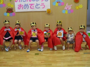 昨日8/25(木)は8月生まれのおともだちの誕生会でした。給食の時からA組の誕生児のお友だちが選んでくれたセレクトメニューを食べ、“早く時間にならないかなぁ”と気分が盛り上がります☆ みんなに1つ!! 1年に1度の大切な日を心を込めてお祝いしました。
