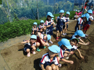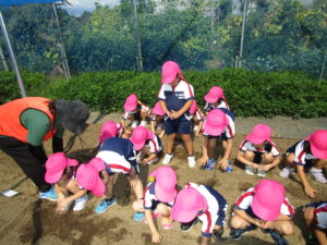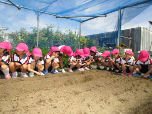 運動会も終わり、今日はひさしぶりの戸外です。そしてこちらもひさしぶりの畑。12月に収穫する大根のたねまきです。