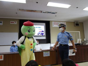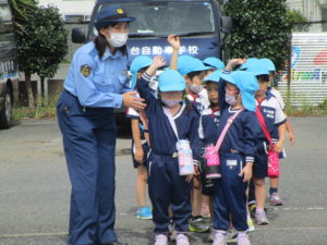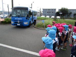 湘南台自動車学校で『交通安全教室』に参加しました。 初めて入る自動車学校にみんな興味津々!!今日は一般の生徒さんはおらず、たんぽぽ保育園のお友だちの貸し切りです。まずは広い講義室で交通安全のお勉強…っと思ったら、なんとカメの“もしもくん”が『交通安全のおべんとう!』が食べられると勘違いをして遊びに♪ “もしもくん”と一緒に、道路に出たら、①お家の人と、手をつなぐ。 ②飛び出しをしない。 のお約束をしました。