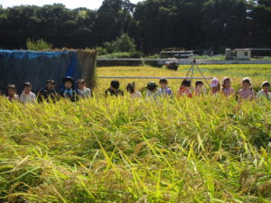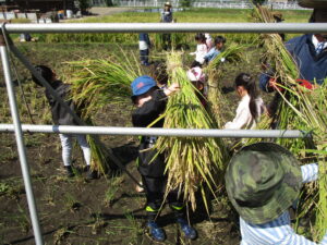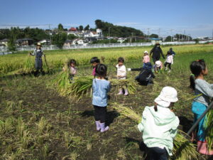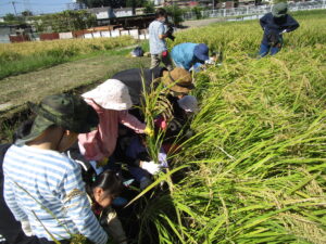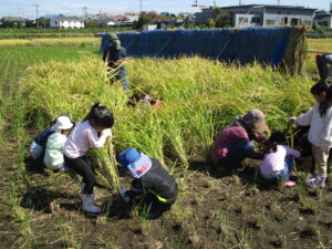 たわわに実った稲と高い空、秋の田んぼ活動が始まりました。数日前まではくもりに傘マークの予報でしたが、今日は、汗ばむほどの晴天に恵まれました。準備運動をおこない、ハサミの取り扱いについてお話を聞いた後、稲刈りスタート!! 稲を持つ人、ハサミで切る人の二人一組になり、「チョキン・チョキン」と切っていきます。