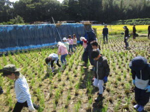 稲刈りの途中にはお母さんカエルやバッタにも会いました。お米になるまでは、あと2つ行うことがあります。一つ目の脱穀はあと10日後です。それまでスズメに食べられないように・・・