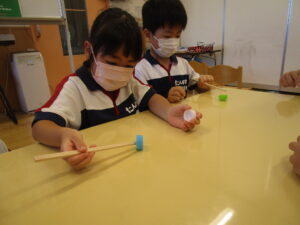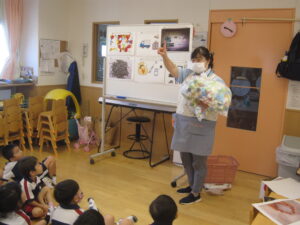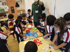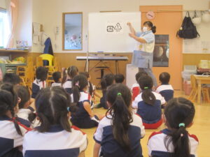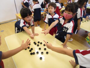 エコキャップを市民センターへお届けする日が近づいています。今日はA組、C組が合同でリサイクルについて考える時間を作りました。保育者の話を聞いて、「古いものが新しく生まれ変わること」「ボトルキャップがお薬に生まれかわるためにはたくさんの数が必要なこと」がわかってくれた様子。その後はキャップを使ってゲーム遊びをしたり、色別に分けたりして遊びました!色別に分けてみると、元の飲み物の色や原料に基づいた色でキャップが作られているかもしれないということに気づき、お家でのお買い物で見つけてみようとみんなで話をしました。A・C組さん合同で楽しい時間を過ごすことができました。