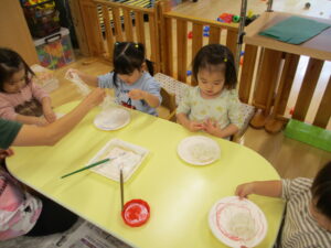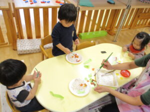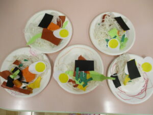 10月に入り、すっかり秋らしくなりましたね。今日の給食はラーメン!という事で、ぽかぽか組もラーメンDAY☆ 朝からラーメン体操で体を温めて、ラーメン作りの制作を行いました。 先日、毛糸遊びで『ラーメン屋さんごっこ』をしたので、毛糸を見るなり“めんめん”と言って想像を膨らませます。毛糸の麺にお野菜、卵、のりをトッピング♪どんぶりにもお絵描きをして、オリジナルラーメンの完成です!! 給食の野菜たっぷりラーメンをみんなで美味しく食べ、大満足でお昼寝しました。