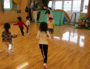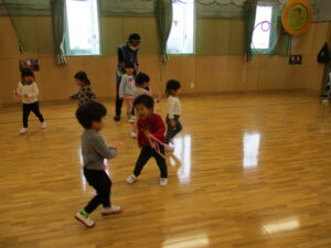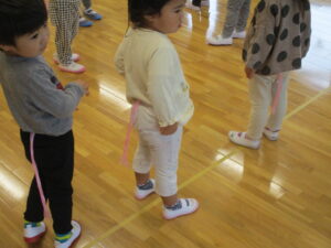 ホールでしっぽ取り遊びをしました。鬼ごっこのようなルールですが、取られないように逃げながら、友だちのしっぽを取りに走ります。