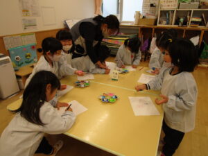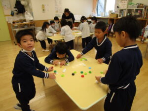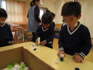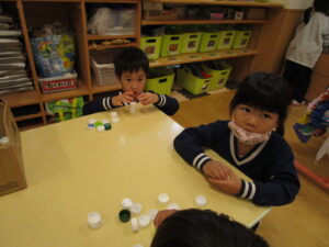 たんぽぽでは、世界のお友だちにワクチンをお届けする目的で「エコキャップ」回収していて、毎年秋~冬に「遠藤市民センター」にお届けすることになっています。ペットボトルのキャップに興味が持てるように、今日は、ペットボトルのキャップを使って4種類の遊びを行いました。