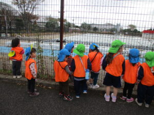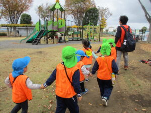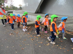 今日は合同で公園の外周を歩いてきました!風が吹きつけるたびに大量の落ち葉が横を通り過ぎていき、大喜びしていた子どもたち。縁石にはたくさんの落ち葉が溜まっており、踏みしめる音を楽しんで秋の季節を感じながら歩いてきました。