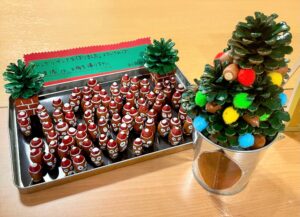 玄関で、どんぐりサンタファミリーが皆さんをお出迎えしています。ファミリーはわくわくB担任の水谷作。右のまつぼっくりツリーは、なかちゃん作。(なかちゃんのコトはこちらで>)