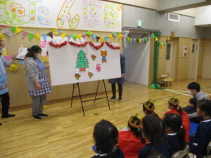 昨日は12月のお誕生会がありました。今月おたんじょうびを迎えるお友だちは4名。●前に出て自己紹介 ●お誕生日カードのプレゼント ●みんなから歌のプレゼント、そして最後は ●先生たちからのお楽しみ! 今月は『もみのきじいさん』というお話のパネルシアターです。寝ているもみのきじいさんを起こさないように嬉しい気持ちや驚いた気持ちを静かに表現していたみんなが可愛かったです。