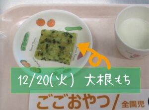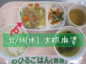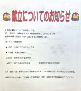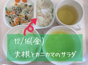 そして、こちらも既に食育レターにてお知らせ済みですが、それに伴う食育の一環として、給食さんにお願いし、14日~22日を『大根週間』とすることに! 給食・おやつメニューのあちらこちらに、だいこんをふんだんに取り入れてもらっています。5回完結編ですが、今日は既に提供した4つのメニューをご紹介!!