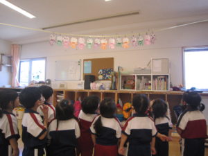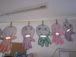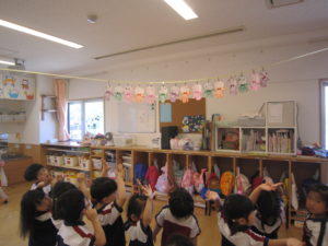 子ども達からは『イカみたーい!』という声も。お部屋に飾ってゆらゆら揺れるてるてる坊主を眺め、これから来る梅雨のお話をしました。『晴れの日がたくさんありますように☆』と皆でお願いしました!
