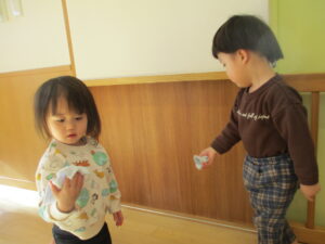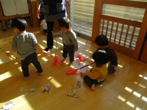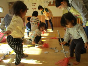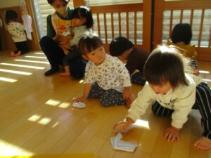 12/26(月)【ぽかぽか】さっさか大掃除!! 2022/12/26 今日はみんなで大掃除を行いました。ノンタンの『ぱっぱらぱなし』のお話で大掃除が何かはバッチリなお友だち。ほうきで掃いたり、ミニ雑巾でふきふきしたり、みんな大活躍!! “お部屋ぴかぴかだね”と言いながら、みんなのお顔も誇らしげに輝いていました☆ ▼さっさかさ!ほうきで掃いて… ▼隅々まで拭いて… ▼汚れが取れた!! 気持ちよく新年を迎えられそうです。ありがとう♪ ぽかぽか 大竹