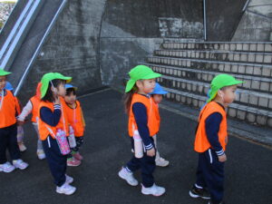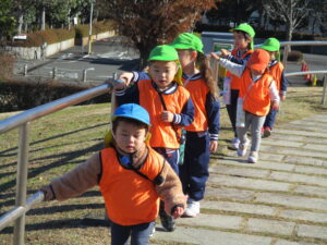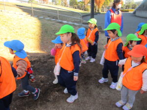 今年最後の戸外散歩に行きました。わくわくC組のお兄さん、お姉さんと手をつないで、真っ青な空の下楽しみました。