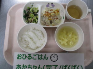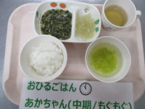 【中期食】五倍粥、ツナとほうれん草の煮物、玉ねぎ煮、キャベツのスープ