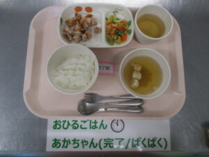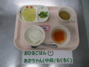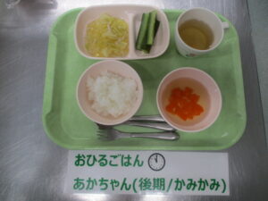 【中期食】五倍粥、しらすとキャベツの煮物、きゅうり煮、人参のすまし汁