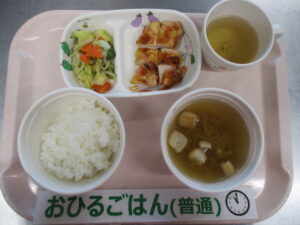 ご飯、鶏肉のチーズ焼き、キャベツのしらす和え、麩とえのきのすまし汁