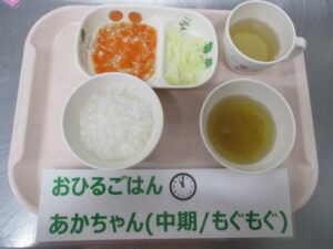 【中期食】五倍粥、鶏ひき肉と人参の煮物、じゃが芋煮、玉ねぎのスープ