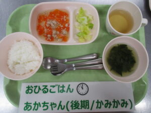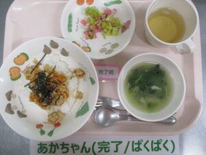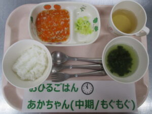 【中期食】五倍粥、鶏ひき肉と人参の煮物、キャベツ煮、ほうれん草の味噌汁