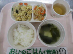 ご飯、高野豆腐の卵とじ、もやしと切干大根のナムル、豆腐とわかめの味噌汁