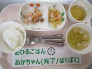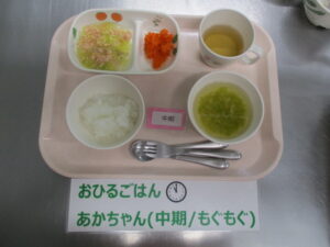 【中期食】五倍粥、鮭と白菜の煮物、人参煮、キャベツのすまし汁