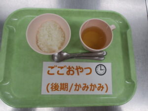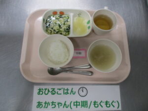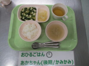 【中期食】五倍粥、豆腐とほうれん草の煮物、玉ねぎ煮、もやしの味噌汁