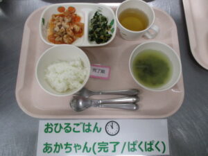 【完了食】軟飯、鶏肉のトマト煮、ほうれん草ソテー、コーンとわかめの味噌汁、オレンジ