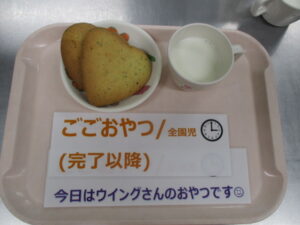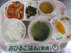 麦ごはん、鶏肉のトマト煮、ほうれん草ソテー、コーンとわかめの味噌汁、オレンジ